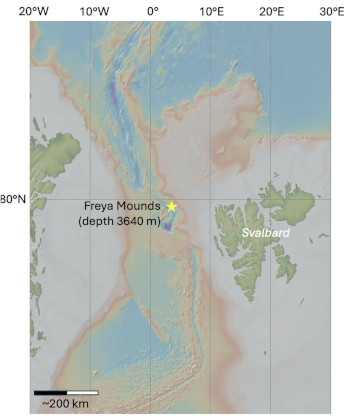 We traced a plume of methane bubbles rising ~3.3 km above the seafloor to find the "Freya Mounds", which are more than 1.7 km deeper than other cold seep ecosystems found in the Arctic so far.