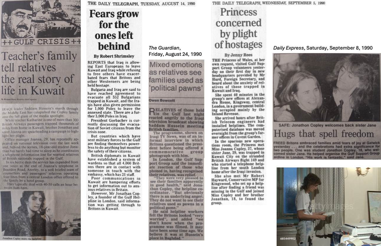 1990: Co-ordinator at the Gulf Support Group, a telephone helpline for relatives of ~4000 British people caught up in Iraq's invasion of Kuwait (including my sister, who was a passenger on British Airways flight 149 that landed there to refuel)