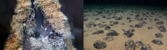 Right: manganese nodules on an abyssal plain, ~4.8 km deep.