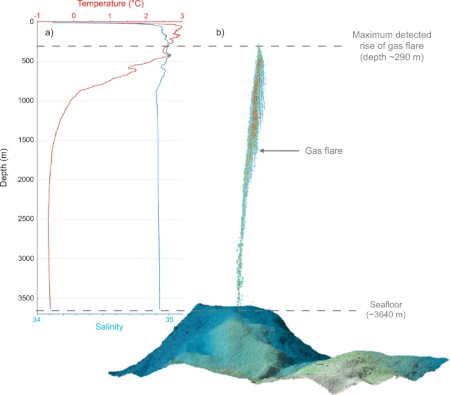 We traced a plume of methane bubbles rising ~3.3 km above the seafloor to find the "Freya Mounds", which are more than 1.7 km deeper than other cold seep ecosystems found in the Arctic so far.