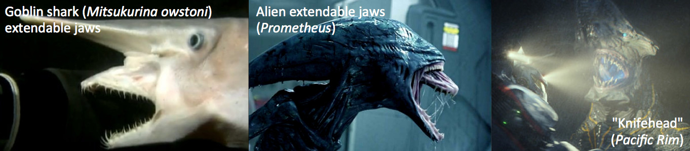 Goblin sharks: extenable jaws like Aliens, & resemble Knifehead from "Robots Bashing Monsters" aka Pacific Rim: