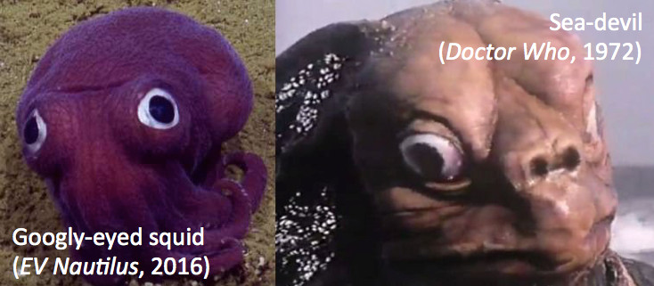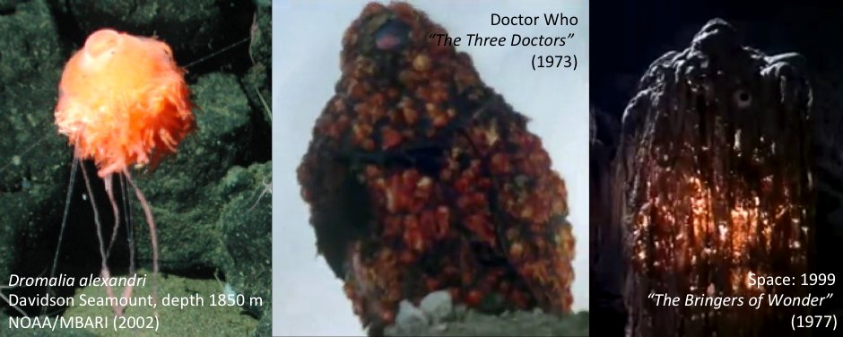 One of my favourite deep-sea/sci-fi matches is a benthic siphonophore (which is also my usual answer to the question "what's the weirdest thing you've ever seen in the deep sea?") and creatures from Doctor Who "The Three Doctors" and Space: 1999 "The Bringers of Wonder" (and fellow Space: 1999 buff Brian Cox agrees!):