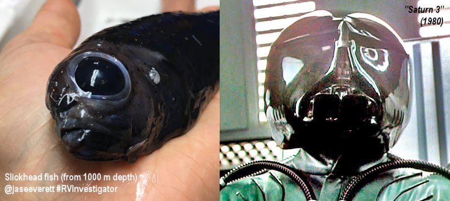 A little obscure perhaps, but this slickhead fish looks like Harvey Keitel's helmet from Saturn 3: